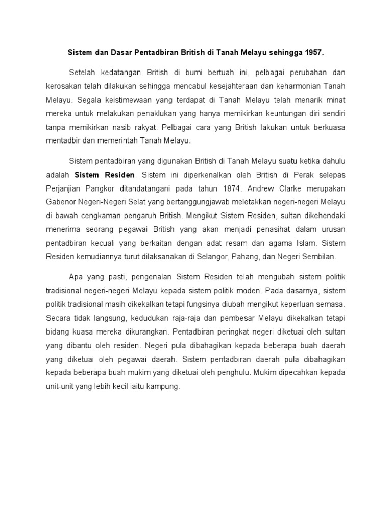 Sistem Pentadbiran Penjajahan British Di Tanah Melayu