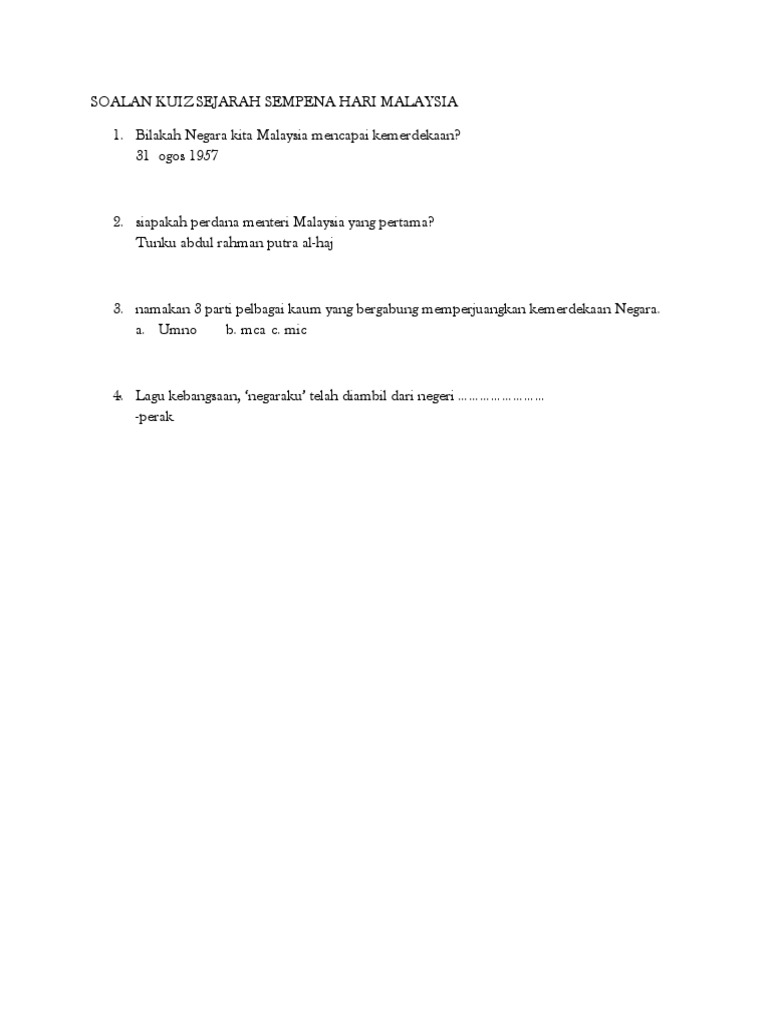 51088319 Soalan Kuiz Sejarah Malaysia Sempena Bulan Kemerdekaan Docx