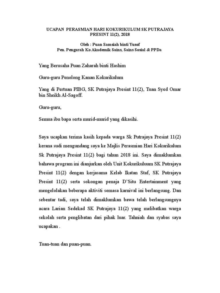 Teks Ucapan Guru Besar Dan Perasmi Hari Karnival Kokurikulum Skpp11 2 2018
