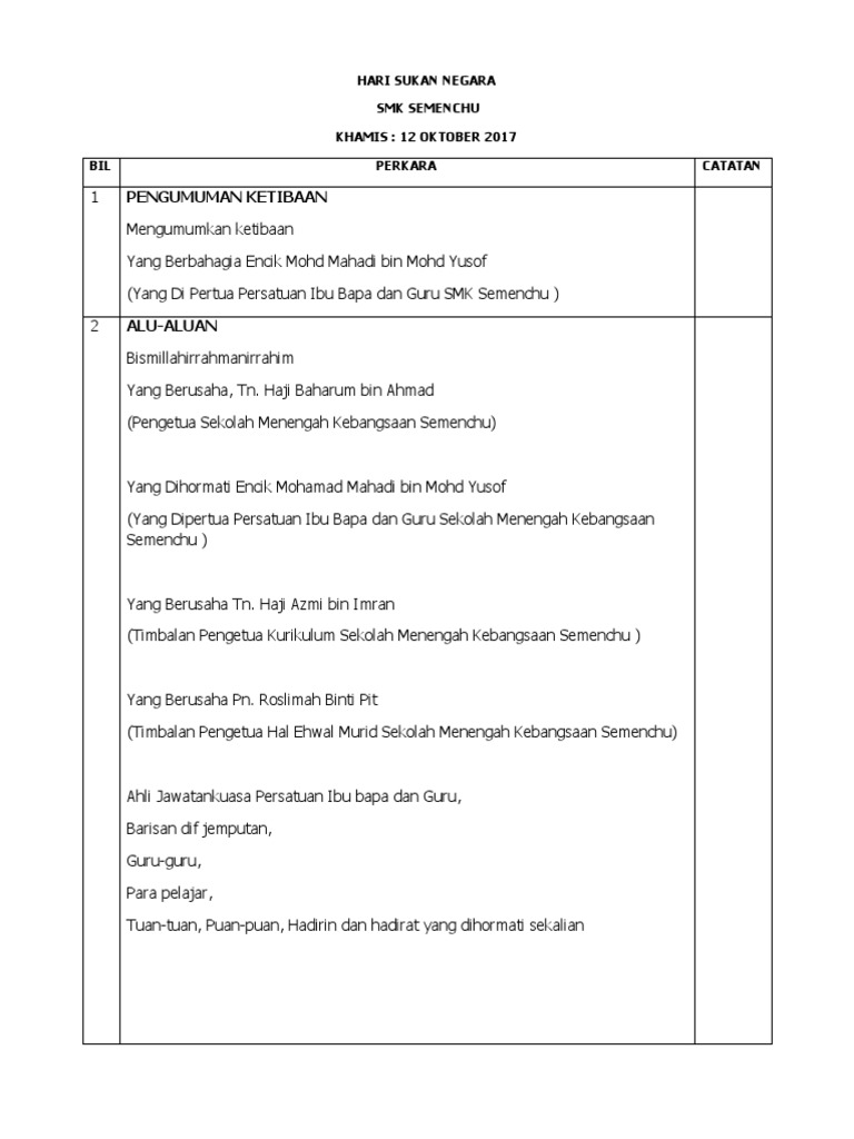 Pengumuman Ketibaan Hari Sukan Negara Smk Semenchu Khamis 12 Oktober 2017 Bil Perkara Catatan