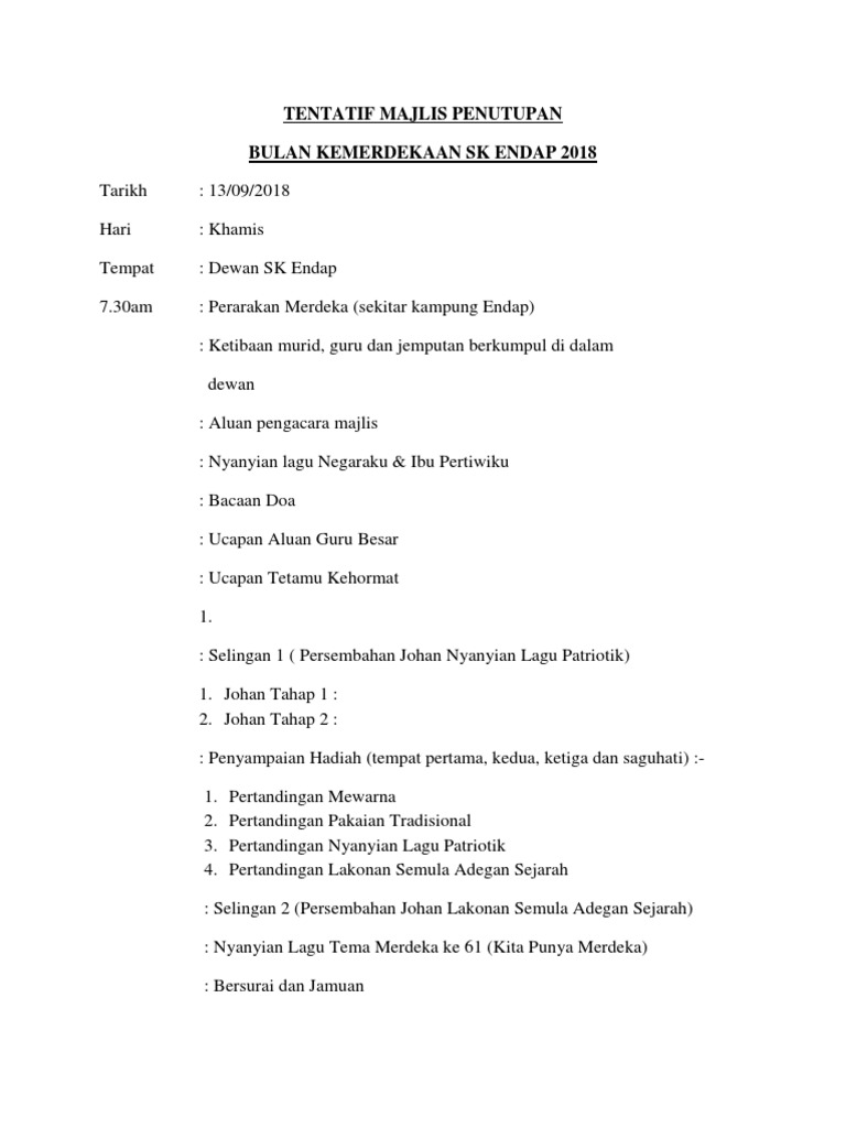 Aturcara Majlis Penutup Bulan Kemerdekaan Peringkat Sekolah Doc Doc Document
