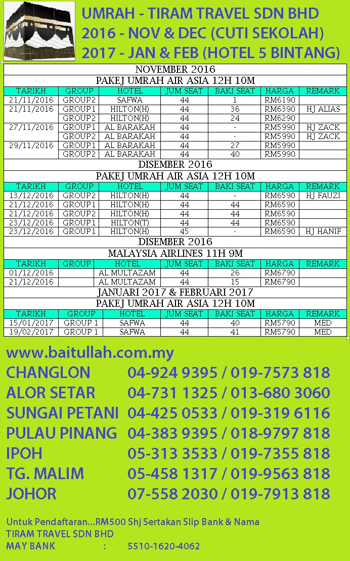 Tiram travel umrah 2017. Umrah tiram travel. Tiram travel sdn bhd specialized in umrah and haj reservation for worldwide ticket domestic international inbound and outbound packages customised package business connection package overseas convention and seminars hotel reservation around the world transportation arrangement and visa application. 03 4042 1436 019 666 4878 dan. Sekadar nak tau untuk preparation minda je sekarang ni pun dh x sedap duduk sebab masih x dapat jadual penerbangan masuk mana dulu etc.